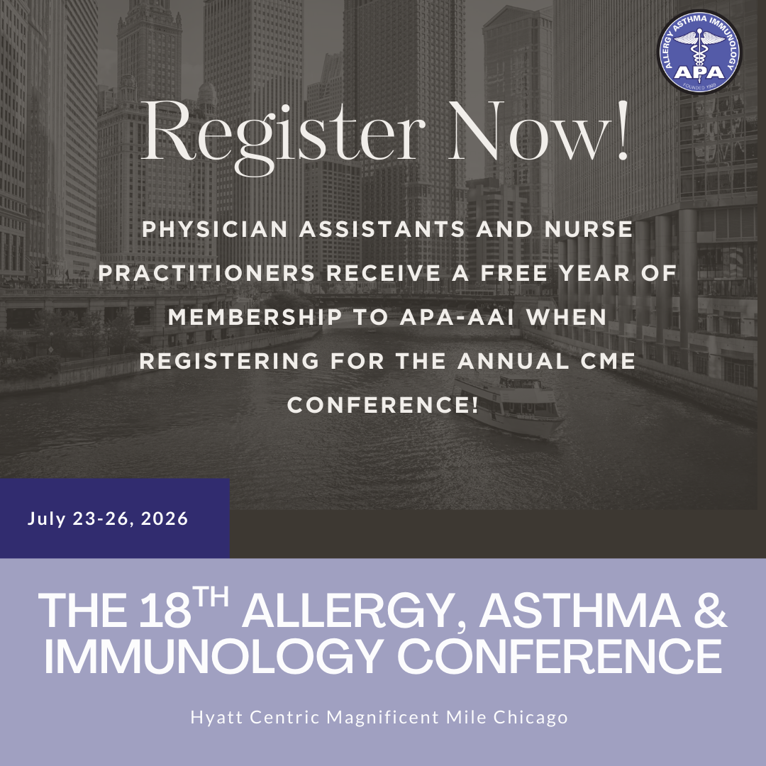 Join the The Association of PAs in Allergy, Asthma, and Immunology (APA-AAI) or renew your membership today to better serve your patients, provide outreach to the medically underserved, strengthen your profession, network with colleagues and celebrate your accomplishments. Take advantage of all APAAAI has to offer.