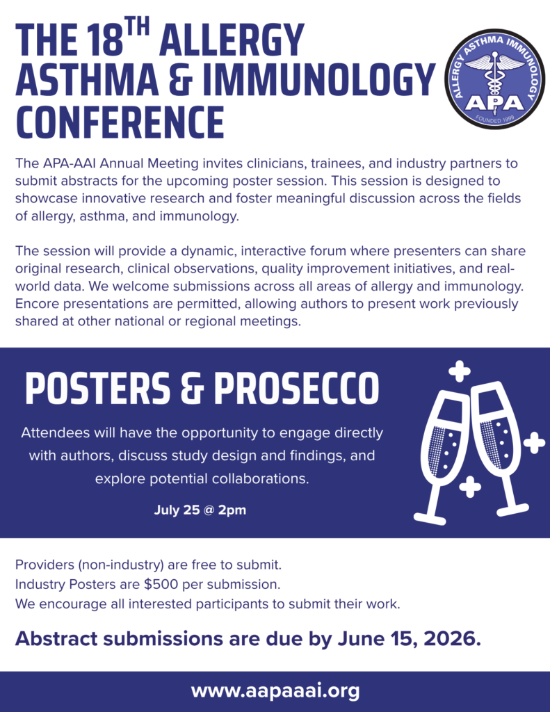 The APA-AAI Annual Meeting invites clinicians, trainees, and industry partners to submit abstracts for the upcoming poster session. This session is designed to showcase innovative research and foster meaningful discussion across the fields of allergy, asthma, and immunology.